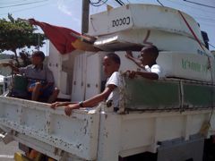 Nous avons regardé la fin de la première parade depuis le zodiac, de peur d'être encerclés par ces bras huileux... nous avons apprécié la seconde sous un soleil de plomb et subi la troisième (que nous n'avions pas prévue !!!) depuis le mouillage. La force de la musique est insupportable même à 500 m et nous entendions trois camions à la fois ! Finalement c'est hublots fermés et ventilateur en marche que nous avons pu nous endormir !