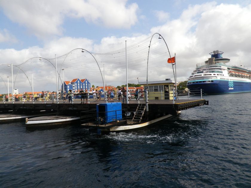 Mercredi 26 mars 2014 : C'est la dernière étape de cette courte saison de navigation : Nous quittons le lagon de Spanish Water et entrons dans celui de Willemstadt où se trouve Curaçao Marine, le chantier où nous sortons le bateau. Pour cela, nous devons demander l'ouverture du pont flottant, ce qui se fait très simplement par VHF. Du coup le flot des touristes s' interrompt et nous sommes l'attraction générale. A droite, côté Punda, il reste un moignon de pont et à gauche, côté Otrobanda, c'est le pont entier qui pivote, emmené par un gros moteur sur le dernier flotteur (dans les caisses bleues). Et maintenant, au travail... rinçage, lessives, rangements, valises... etc... et sortie du bateua par un moyen inédit !